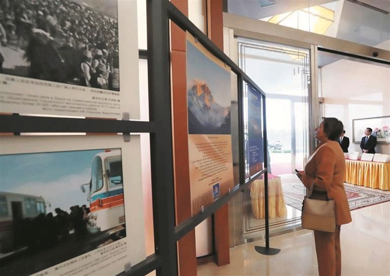 ཤིན་ཧྭ་གསར་འགྱུར་ཁང་དུ་གྲོང་ཁྱེར་མེན་སི་ཁེ་ནས་གློག་འཕྲིན་འབྱོར་གསལ། ཉེ་ཆར། བོད་རང་སྐྱོང་ལྗོངས་དབུ་བརྙེས་ནས་ལོ་ངོ་60འཁོར་བའི་འཕེལ་རྒྱས་གྲུབ་འབྲས་ཀྱི་པར་རིས་འགྲེམས་སྟོན་བྷེ་ཨུ་རུ་སུར་བཅའ་སྡོད་ཀྲུང་གོའི་གཞུང་ཚབ་ཆེ་མོ་ཁང་དུ་གཉེར་ཞིང་། བྷེ་ཨུ་རུ་སུའི་སྲིད་དོན་ལས་རིགས་དང་། དམག་དོན་ལས་རིགས། མཁས་དབང་། སྨྱན་སྦྱོར་གྱི་འཐུས་མི་སོགས་མི་300ལྷག་ཙམ་གྱིས་འགྲེམས་སྟོན་ལ་བལྟས་པ་རེད།